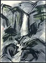 Unlike traditional apprenticeships in China and Japan, Jikihara encouraged Hofmann to create his own compositions and develop his own style. "Even while his drawings are so much imbued with Japanese style, they have a vivacity of line, stroke and expression which is very personal."[9] With time, Hofmann’s work branched out into oils and other media and his brushwork began to push traditional limits. He also introduced "subjects not common to the sumi-e genre, like erotic nudes and urban landscapes."[3] His paintings’ "bold strokes, forceful gestures and energy… catch a moment or a mood undistracted" making "emotions palpable."[10]