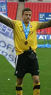 Ingham was released by Hereford at the end of the season,[71] after which he moved down to the Conference Premier by rejoining former club York City on 14 May 2008 on a two-year contract.[72][73] He suffered a thigh injury during a pre-season friendly against Harrogate Railway Athletic,[74] meaning he missed York's opening match against Crawley Town on 9 August 2008, which led to the loan signing of Artur Krysiak from Birmingham City.[75] Ingham recovered from his thigh injury ready for York's fourth match of 2008–09 against Northwich Victoria.[76] Despite this, Josh Mimms played in goal and Ingham eventually made his first appearance of the season in a 1–1 home draw against Barrow on 25 August 2008.[77] He saved a penalty kick during a penalty shoot-out against Mansfield Town in the Conference League Cup third round, helping York win the shootout 4–2, which followed a 1–1 home draw after extra time.[78] He picked up a hamstring injury during a 1–1 away draw with Histon on 9 December 2008,[79] and returned in York's next match, a 2–0 away win over Northwich in the FA Trophy on 16 December.[77][80] Ingham saved the final penalty in a shoot-out victory at home to Kidderminster Harriers in an FA Trophy third round replay on 11 February 2009, giving York the victory 13–12 on penalties.[81] He started in the 2009 FA Trophy Final at Wembley Stadium on 9 May, which York lost 2–0 to Stevenage Borough.[77] Ingham finished his first permanent season at York with 52 appearances.[77]