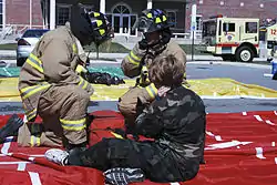 Firefighter TSgt Kurt Brunsman aids a tornado casualty portrayed by a Civil Air Patrol Cadet during a tornado response exercise held at Selfridge Air National Guard Base.