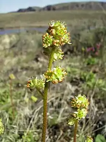 Micranthes nidifica, the peak saxifrage, is a species of plant in the saxifrage family. It is native to the northwestern United States, where it grows in moist habitat, often in mountainous areas. It is a perennial herb growing from a caudex and system of rhizomes and producing a basal rosette of leaves. Each leaf is up to 10 centimeters long with a smooth-edged or minutely toothed blade on a thin petiole. The inflorescence arises on a peduncle up to half a meter tall and bears clusters of flowers with white petals.