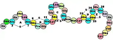 - ↑ Castiglione, Franca; Lazzarini, Ameriga; Carrano, Lucia; Corti, Emiliana; Ciciliato, Ismaela; Gastaldo, Luciano; Candiani, Paolo; Losi, Daniele; Marinelli, Flavia (2008-01-25). "Determining the Structure and Mode of Action of Microbisporicin, a Potent Lantibiotic Active Against Multiresistant Pathogens". Chemistry & Biology. 15 (1): 22–31. doi:10.1016/j.chembiol.2007.11.009. PMID 18215770.