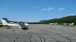 The aircraft parking aprons at the facility are approximately 87,000 ft2[4] and encompass approximately 170,000 ft2 of area.[5] The principal apron is located northwest of Runway 19 and has the capacity to hold 42 aircraft. The secondary apron is located in front of the terminal building and has the capacity for 10 aircraft. A small fueling apron is located between the two parking aprons. Aircraft tie-down spaces are leased by the facility's FBO from the State of Vermont.
