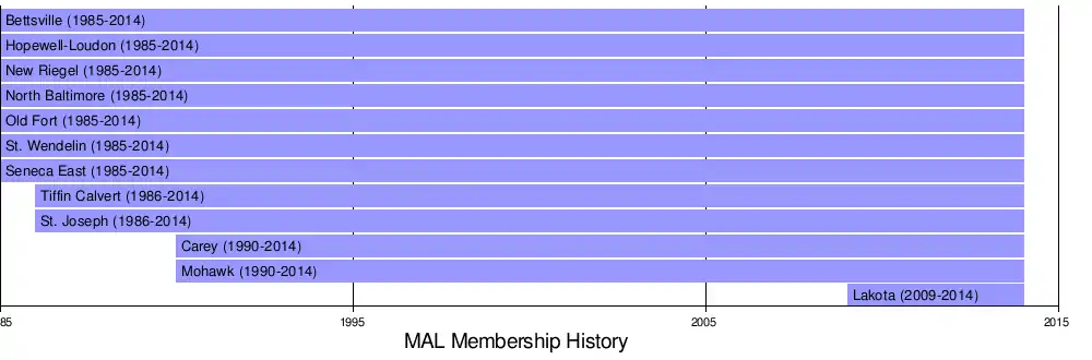 - The MAL was created for the 1985-86 school year's basketball season with Bettsville, Hopewell-Loudon, New Riegel, Old Fort and Seneca East coming from the crumbling Seneca County League to combine with North Baltimore and St. Wendelin from the former Lakeshore Conference. Hopewell-Loudon and Seneca East were also full members of the Lakeshore Conference. Tiffin Calvert and St. Joseph agreed to join the league, but were not able to leave the Sandusky Bay Conference until the 1985-86 school year ended.