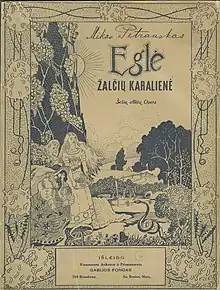 Petraukas started writing his second opera Eglė žalčių karalienė in 1910, but finished it only in 1923.[2] It premiered on 30 May 1924 at the Grand Opera House in Boston.[20] Petrauskas performed the main male role at the premiere. The opera is based on the Lithuanian folktale Eglė the Queen of Serpents which was developed into a five-act drama by Aleksandras Fromas-Gužutis. Petrauskas added an additional act to further explore the meeting between Eglė and her future husband Žilvinas the Serpent.[2]