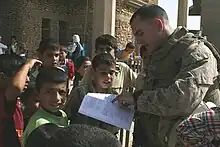 1st Lt. Mike Gallagher reading a book to children at Al Moaine elementary school Rawah, Iraq, 13 October 2008