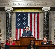 Johnson was sworn into office as a member of Congress on January 3, 2017.[47] He has served as vice chairman of the Republican Conference, a deputy whip for House Republicans,[48] a member of the Judiciary Committee,[49] a member of the Armed Services Committee,[50] and a chairman of the Republican Study Committee.[51] Johnson was supported by the House Freedom Caucus PAC and frequently attended its meetings while never formally joining as a member.[52][53]