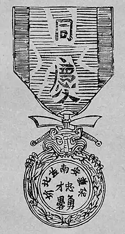 The Military Medal of Annam, also known as the Military Medal of Emperor Đồng-Khánh; officially the Military and Native Guard Merit Medal, was a short lived Order of Merit of the French protectorates of Annam and Tonkin within the federation of French Indochina.[1] The Military Medal of Annam was awarded to Annamese and Tonkinese soldiers of the Tirailleurs indochinois, the Garde indigène de l'Annam er du Tonkin, and other Indochinese military forces as well as police officers in the Garde Civil indigène for distinguished action or serious wounds.[1]