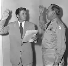 Murphy was initially assigned to the Intelligence Office headquarters, 1st Battalion, 141st Infantry as S-2, and attended the Guard's two-week summer training at Fort Hood as a range officer.[133] 19 December 1950, Murphy was transferred to division headquarters as an aide to Ainsworth.[134] At the 1951 summer training camp at Fort Polk, Louisiana, Murphy was in charge of training approximately 500 inexperienced new recruits in bayonet, marksmanship and close order drill.[135] Fellow instructor Captain Tom Berry remembered, "In my opinion, Audie Murphy set the tone for the obvious high esprit de corps for the 36th Division which lasted throughout my association with the Division [eighteen years]. Audie Murphy walked the way he talked."[136]