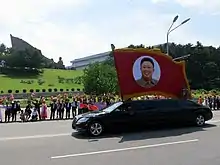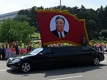 It celebrated the KPRA's ruby jubilee.[5] Unlike the first parade, this parade included more diverse contingents of troops, particularly motorized infantry.[6] According to a later defector from the Pyongyang Defense Command, a female officer collapsed after her appendix burst following the parade, to which she was "praised" by her superiors for having concealed it.[7] Head of the Royal Government of the National Union of Kampuchea Prince Norodom Sihanouk, Marshal of the Soviet Union Kirill Moskalenko and commander of the Shenyang Military Region Chen Xilian were among the foreign dignitaries at the parade.