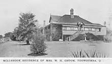 The place has a strong and special association with the Groom and Row families, which is valued by the community. Newspaper proprietor and politician William Henry Groom represented Toowoomba in the first Queensland and Commonwealth Parliaments. MLA Groom's main interests were land policy, agrarian reform and ensuring expenditure on roads and services within his electorate. Millbrook is important also for its association with Mrs WH Groom, wife and mother of politicians and active member of the community, who resided here for 30 thirty years. Dr Row was an important Toowoomba medical man who served in both World Wars. Lieutenant-Colonel Row was in charge of the Greenslopes Hospital 1946-1947. From 1948 to 1979 he conducted his private practice from Millbrook while being a surgeon at most of the local hospitals and the Toowoomba Army Area Officer.[1]