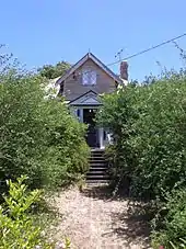 A picket fence separates the small front garden from the driveway and footpath. A pathway from the drive and front gate leads to the front door and around to the northern porch entry.[1]