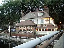 In 1582 Mill Fields Lane ran from Clapton to Jeremy's Ferry in the Leyton Marshes. At the same spot a timber bridge was built in either 1745,[2] or sometime after 1757.[3] After this, the road became known as Lea Bridge Road, with a tollgate at the Clapton end. A toll house was built on the west bank of the river in 1757, and the bridge rebuilt in iron in 1820–1. Tolls continued to be levied until 1872.