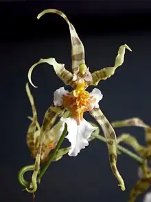 The flowers have a rounded but slightly triangular ovary; their segments are wide opened with yellow green sepals and petals, transversally stained or striped of brown; and white labellum with a yellow warted callus close to the base surrounded by brown orange stains. The sepals and petals are linear, elongated and highly acute, curved at the apexes, the petals slightly shorter and wider that the sepals and the sepals more twisted than the petals. The labellum is slightly convex, shorter than the other segments, almost flat, three lobed, the lateral ones are rounded forming two auricles and the intermediate is triangular, highly pointed and spotless. The column is curved with two large often laciniated wings lateral to the stigma and a terminal anther.[3] Miltonia phymatochila blooms between from the end of summer to middle autumn and its sweet fragrant flowers last for about two weeks. There is no reference about their pollinators.