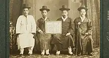 This photo was taken with friends on April 24, 1906, before Min left to study abroad. In the photo, it is presumed that the person on the far right wearing glasses, holding a cane, and wearing Western-style shoes is Min Chu'ng-sik.[1]