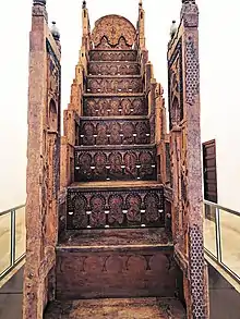 The Minbar of the Kutubiyya Mosque is a minbar (Arabic: منبر; a mosque furnishing similar to a pulpit) produced in Cordoba, Spain (al-Andalus at the time), in the early 12th century by order of the Almoravid amir Ali ibn Yusuf. The minbar was commissioned for the main mosque of Marrakesh, the Almoravid capital in Morocco. After the Almohad conquest of Marrakesh in 1147, the minbar was moved to the new Kutubiyya Mosque built by Abd al-Mu'min. It remained there until 1962, when it was moved into storage and then to the El Badi Palace for public display, where it remains today. Made primarily of wood and decorated with a variety of techniques, the minbar is considered one of the high points of Moorish, Moroccan, and Islamic art.[1][2][3][4] It was enormously influential in the design of subsequent minbars produced across Morocco and the surrounding region.[1][3]