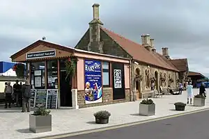 The station is on the sea front and close to the town centre. A wide, single platform has tracks on both sides. The main track on the seaward side is platform 1, while platform 2 stops short of the stone-built station buildings. The old goods shed is opposite the station building and is now used as a locomotive workshop, and a newer carriage workshop is close by. Opposite platform 2 is the turntable, overlooked by a cafe operated by the railway. The buildings on the platform include a booking office and a shop selling souvenirs.