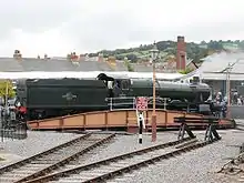 The original turntable was removed from the station in 1967, after steam trains and GWR Autocoach services were completely replaced by Diesel Multiple Units. The WSR acquired both the 55 feet (17 m) turntable and water tower from Pwllheli railway station in anticipation of reinstalling a facility at the station, but later sold the water tower to the Welshpool and Llanfair Railway in 1999. In 2007, the company agreed plans for a £6M development with Somerset Council, to provide a new site for the turntable, together with a viewing area, extended car parking and some ancillary buildings.[3] The turntable was extended using genuine-GWR engineering pattern drawings to 65 feet (20 m),[4] and then installed at its new location, brought into use in May 2008.[5]
