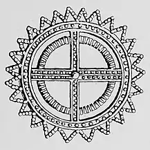 Similar comments have been made by Minas Tsikritsis in April 2011 in public.[8][9] He described together with Efstratios Theodosiou the smaller round image to the right of the female figure as a Minoan cosmology model with the planetary system above the Flat Earth, in which the cross that symbolises the sun is surrounded by 18 dots and those including the crescent-shaped moon symbol are surrounded by 28 dots, an indication hinting at the Saros cycle with 28 lunar eclipses in 18 years. This is approximately 30 millimetres (1.2 in) long and 62 millimetres (2.4 in) high.[10] They interpret the spoked disc on the other side of the female figurine, which is associated with Titaness Rhea, as a portable analog calculator, which was created 1400 years before the Antikythera mechanism.[10][9]
