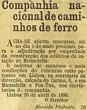 Announcement of the tender for the construction of the Mirandela Station, in April 1886