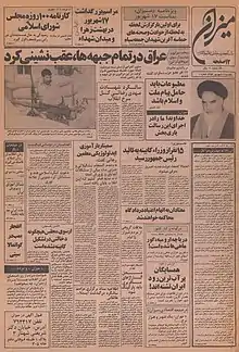 On 7 April 1981, the prosecutor-general closed down the newspaper and arrested its managing editor.[10] The information ministry also ordered printing companies not to print it.[11] In the last issue published on that day, the newspaper had written in response to the accusations that its "only offense was to raise one basic question: whether the secretary general of a political party should also be chief justice", referring to Mohammad Beheshti who was secretary-general of the Islamic Republican Party.[1]