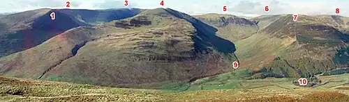 The next range of hills to the west is the Lowther hills wherein lies the source of the River Clyde.[3]