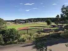 As the population of Heber and Overgaard grew, a local high school was planned. Prior to the school's construction, two buses shuttled students to and from Snowflake in order to attend high school classes.[1][4] The school was established in 1989, with high school classes and sporting events held at Capps Elementary School until school buildings could be completed.[5] Construction for Mogollon High School, by Spencer-Trulson, began on June 12, 1989.[1] The site was formerly used for rodeo grounds and later a sawmill.[4] The school was named after the nearby Mogollon Rim. The buildings were accepted by the governing board January 5, 1990.[1] Funds were not immediately available to complete landscaping, purchase a stage, put in all of the gym bleachers or finish the office.[1] A public dedication ceremony was held for the new school on January 18, 1990.[1]