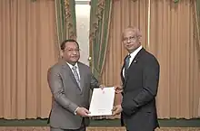3. Adam, Mariyam Afaaf (24 October 2019). "New Maldivian ambassador to Saudi Arabia presents credentials to King Salman". raajje.mv. Retrieved 21 December 2023.