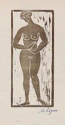 His artistic career began in 1908, when he exhibited for the first time in Paris, at the Salon d'Automne.[7] The following year, he became one of the founding members of the Expressionist group Neue Künstlervereinigung.[7] During this period in Paris, Kogan was supported by the sculptors Rodin and Maillol.[3] His talents were noticed by the art collector and patron Karl Ernst Osthaus, who worked for Kogan in later years, and offered the young artist a teaching position at the Folkwang Museum in Hagen.[7] This situation was short-lived, and Kogan moved back to Munich, and then Paris, At the invitation of Henry van de Velde, he briefly taught at the Kunstgewerbeschule in Weimar. He led a transient life during this period, and lived variously in Switzerland and Berlin as well. In Berlin, he was promoted by the prominent art-historian Max Sauerlandt and in the 1920s, Kogan's art was exhibited alongside artists from the Berlin Secession.[7]