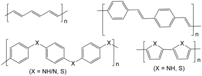 Chemical structures of some conductive polymers. From top left clockwise: polyacetylene; polyphenylene vinylene; polypyrrole (X = NH) and polythiophene (X = S); and polyaniline (X = NH/N) and polyphenylene sulfide (X = S).