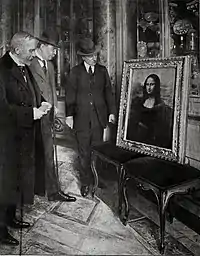 In 1911, the painting was still not popular among the lay-public.[88] On 21 August 1911, the painting was stolen from the Louvre.[89] The painting was first missed the next day by painter Louis Béroud. After some confusion as to whether the painting was being photographed somewhere, the Louvre was closed for a week for investigation. French poet Guillaume Apollinaire came under suspicion and was arrested and imprisoned. Apollinaire implicated his friend Pablo Picasso, who was brought in for questioning. Both were later exonerated.[90][91] The real culprit was Louvre employee Vincenzo Peruggia, who had helped construct the painting's glass case.[92] He carried out the theft by entering the building during regular hours, hiding in a broom closet, and walking out with the painting hidden under his coat after the museum had closed.[24]