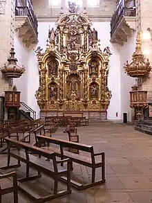 One of the most striking features of the main altarpiece is its double function as a double-faced retable-baldachin, one towards the nave and another towards the choir of the monastic community. It is organized by two bodies with profuse decoration in gold leaf, with salomonic columns, scrolls, pearls, acanthus leaves, small vegetal decoration ... and its iconographic discourse is articulated around the Assumption and Coronation of the Virgin.