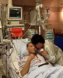 A patient of an intensive care unit in a German hospital in 2015, with a monitoring screen displaying a graphical electrocardiogram, the heart rate and blood pressure all in real time