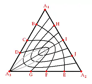 The Morin surface has a quadruple point through which passes its axis of symmetry. This quadruple point is the starting point and the end point of six lines of double points. Each of the quarter sections is bounded by three of these lines of double points, so that each quarter section is homeomorphic to a triangle. Section East is now shown schematically: