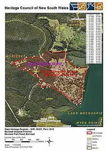 The overall Morriset Hospital site comprises almost 100 historic buildings on a 1,244-hectare (4.80 sq mi) site. It is approximately 3 km south-east of the township of Morisset south of Duck Hole Creek and facing east.[3]