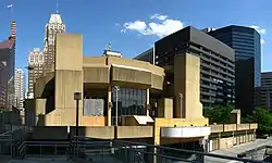 Mechanic planned the theatre to replace the aging Ford's Grand Opera House, which he had purchased in 1929 and had demolished in February 1964, replaced by a parking garage for Stewart's Department Store. A year later, he also had the Stanton Theatre (located at 516 North Howard Street) demolished in July 1965 (also replaced by a parking lot) to avoid any competition with his new theatre which bore his name. Mechanic bought the theatre from The Stanley-Warner Co in February 1958 and changed the name to The Stanton in the fall of 1959, using it primarily for legitimate shows, closed circuit television shows, variety shows, and movies and also including live performance shows which he leased to JF Theatres. He engaged architect John M. Johansen who designed the building in a style he termed “functional expressionism”, also known as brutalism.[1] Mechanic chose the site formerly occupied by offices of The Baltimore Sun.