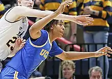 Brown was inconsistent as a freshman, dominating some games while being a nonfactor in others.[14] In the season opener, he scored 19 points on 9-of-10 shooting, including five slam dunks, and had 17 rebounds in a 96–71 win over Purdue Fort Wayne.[15] He was the first UCLA player to have 19 points and 17 rebounds in his college debut since Lew Alcindor, known later as Kareem Abdul-Jabbar.[lower-alpha 1] On November 16, 2018, Brown had 23 points and 14 rebounds in a 95–58 win over Saint Francis to become the first UCLA freshman to record a double-double in his first three games. He nearly had a triple-double with eight blocks in 29 minutes, having left the game for good with around six minutes remaining.[16][17] After facing smaller post players from small-program schools, Brown struggled offensively against Nick Ward of No. 11 Michigan State with only five points, 10 rebounds and three blocks in an 87–67 loss to the Spartans in the Las Vegas Invitational.[18] In the consolation game, UCLA dropped its second straight contest to a top-15 team, losing to No. 7 North Carolina as Brown played just eight minutes before fouling out.[19] On December 2, he had 12 points, 10 rebounds, and three blocks in an 82–58 win over Loyola Marymount. It was his first double-double since the third game of the season, and it came in his first matchup against a fellow 7-footer, the Lions' 7-foot-3-inch (2.21 m) Mattias Markusson.[20][21] On January 26, 2019, Brown snapped out of a two-week slump with 11 points, 15 rebounds and two blocks to help the Bruins end a three-game losing streak in a 90–69 win over Arizona.[22] He missed the regular season finale against Utah due to an unspecified violation of the school's student-athlete code of conduct.[14]