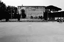 The Latin America Pavilion constitutes the other half of the headway leading to the Fountain. Designed in 1938 by Bruno Lapadula as a group of Bank of Italy pavilions arranged around a garden courtyard. On the façade overlooking the fountain was a painting by Giorgio Quaroni. The pavilions were damaged by war bombings and subsequently restored for the reopening in 1952 on a project by Michele Capobianco, Arrigo Marsiglia and Alfredo Sbriziolo. The 1952 project endowed the pavilion with a loggia characterized by a rationalist appearance with typical Nordic origins that recall in particular the Dutch neoplasticism and the slender steel structures of Ludwig Mies van der Rohe. Currently the pavilion has been recovered by Studio Campagnuolo and Cherubino Gambardella.[7]