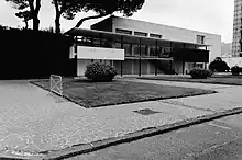The building, together with the Latin America pavilion, forms the head of the Fountain of the Esedra. This constraint strongly conditioned Carlo Cocchia to design the building in 1938 according to an asymmetrical T-shaped scheme characterized by the unusual functional coupling of an Olympic-size swimming pool with diving board in the stem of the T and the restaurant room at the head. The connection to the various floors is guaranteed by an architectural promenade of clear Lecorbusieran ancestry. In the 1952 restoration, carried out by Cocchia himself, the ramp was reconfigured by knocking down the roof slab and opening the lateral infills of the loggia on the main façade. Currently the building has been recovered by Massimo Pica Ciamarra who has recovered the original forms of the work and has adapted the entire building to the new requests by also adding an underground pool below the original one. The interiors are characterized by the three-tiered division of the dining room which allows spectators, guests of the restaurant, to easily observe the 180-degree view of the swimming pool, the Flegrea Arena and the Esedra Fountain. The floor is decorated with Neapolitan majolica with references to Mediterranean cuisine.[6]
