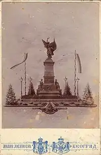 - "Spomenik Kosovskim Junacima" (Monument to the heroes of Kosovo), was sculpted by Đorđe Jovanović and erected in Kruševac on Vidovdan 1904, not before it was first showcase at the Exposition Universelle in 1900. In 1889, on the 500th anniversary of the Battle of Kosovo, Aleksandar Obrenović laid the foundations for the monument. The woman on the southern side of the monument symbolizes Serbia, which with an outstretched hand towards the south, calls for the liberation of her enslaved brothers, promising a crown of glory to the liberators.[8]