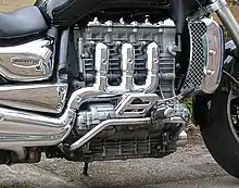 Three-cylinder engines, a.k.a. triples, are normally mounted transversely. The British Hinckley Triumph factory has specialized in transverse triples, although their 2,300 cc Rocket III has its engine mounted longitudinally. Other examples are the Benelli' "Tre"and the Yamaha XS750. The Italian firm Laverda made a few 1,000 cc and 1,200 cc triples. Some Laverda Triples had 120° cranks, while some had 180° cranks, essentially three-quarters of a four. BMW made the K75 longitudinally mounted 750 cc triple with the cylinders parallel to the ground. Meriden Triumph developed the 750 cc Trident, from which BSA "badge-engineered" the Rocket-3.