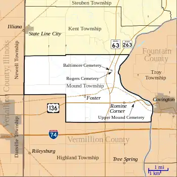 According to the 2010 census, the township has a total area of 16.79 square miles (43.5 km2), of which 16.57 square miles (42.9 km2) (or 98.69%) is land and 0.22 square miles (0.57 km2) (or 1.31%) is water.[2] The town of Foster is located just north of U.S. Route 136, about 1 mile (1.6 km) east of the township's southwestern border. Extinct communities in the township include Baltimore, which thrived on the banks of the Wabash River in the early 19th century, and Romine Corner. The streams of Kitchen Creek and Possum Run run through the township.
