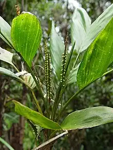 The high altitude and rainfall of the mountain create conditions for a number of vegetation types growing on the poor granitic soils.[7] The lower slopes support lowland tropical rainforest (complex mesophyll vine forest) with a great diversity of large leaved trees, climbers, epiphytes, palms and ferns. With increasing elevation the rainforest changes to a less diverse smaller leaved notophyll type. At elevations above 1000 m, simple microphyll vine fern forest is found with species such as the purple kauri pine (Agathis atropurpurea), Elaeocarpus ferruginiflora and pimple bark (Balanops australiana). With further increases in altitude, increasing exposure and cloud contact create conditions ideal for the formation of cloud forest (simple microphyll vine fern thicket); many of the species are rare or endemic and most trees are shrouded in mosses and other bryophytes.[8] [9][10][11]