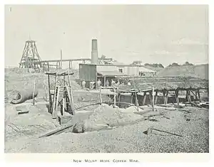By 1883 the New Mount Hope mine was employing 200 men and boys and had produced 2,088 tons of ore to produce 431 tons of copper. A township of 800 people had grown up around the mine with four hotels, a billiard hall and boxing saloon, four stores, a post office and a bank.[5] This was a prosperous period for the New Mount Hope company; for several years dividends of 2s. 6d. per share were paid to shareholders.[20]
