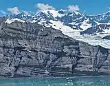 Looking north from Icy Bay to Mt. Huxley above Yahtse Glacier, and Mt. St. Elias to right