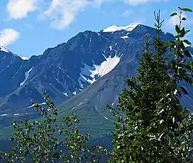 Mount Martha Black, elevation 2,512-metre (8,241-foot), is the highest point in the Auriol Range of the Saint Elias Mountains in Yukon, Canada.[1] The multi-summit massif is situated 11 km (7 mi) southwest of Haines Junction, 16 km (10 mi) northwest of Mount Worthington, and 18.6 km (12 mi) southeast of Mount Archibald, which is the nearest higher peak.[3] Set within Kluane National Park, Mount Martha Black can be seen from the Alaska Highway, weather permitting. The mountain was named after Martha Black (1866-1957), the second woman elected to the House of Commons of Canada.[4] The mountain's name was officially adopted August 12, 1980, by the Geographical Names Board of Canada.