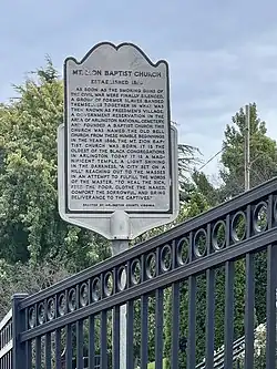 Mount Zion Baptist Church was designated a historic landmark in 1986, with a marker placed on the property on 17 September 1986 by the Arlington Historical Landmark Review Board. The marker noted the church's founding in Freedman's Village and status as the oldest African American congregation in Arlington, Virginia.[36]
