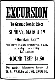 Advertisement, placed March 10, 1905, for an excursion on Mountain Gem, from Lewiston, Idaho, to the Grande Ronde River.
