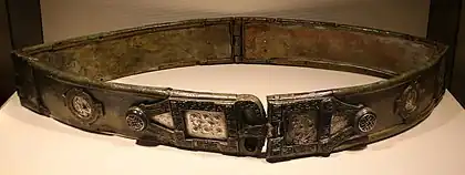 The belt is defined by the false buckle joining the two front segments. Each of these segments contains a large red and blue glass stud,[9] and settings for silver die-stamped rectangular panels; a rare form of metalwork decoration for the period.[10] Five of the panels survive, including two near the hinges, and two forming the false buckle and counter-plate.[1] The glass medallions are unusually large, perhaps their size served to hide the joint-plate and rivets linking the visible metal sheets.[9]