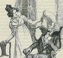 With his cosy domesticity, his childlike simplicity, and kindly hospitality, Mr Woodhouse has been seen as a charming figure by generations of readers – as one of the most enchanting of chumps.[1] A minority of critics, however, have taken a rather harsher view. Ronald Blythe, for example, insists that "Mr Woodhouse, so wrongly and oddly regarded as an old pet by generations of readers, is actually a menace",[2] threatening Emma's future happiness by tying her to him and opposing all changes, especially marital. To Barbara Hardy, this complaint was an anachronistic view of an affectionate and unpredatory figure.[3] Still, his role in the courtship plot is certainly that of what Northrop Frye called a "blocking character",[4] even if one acting through weakness not strength[5] – the tyranny of invalidism.[6]