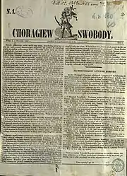 Two illegal Polish language were also printed either by Kalinowski or under his approval or patronage, The Flag of Freedom (Chorągiew Swobody) and The Voice of Litva (Głos z Litwy). The intended audience of both these newspaprs was nobility; both also lack any "contentious social slogans slogans that emanated out of the periodical Mužyckaja Praŭda".[14] Three issues of The Flag of Freedom were published.[15]